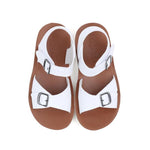 Journey White Sandals is a super comfortable sandal with a soft leather feeling and a wide insole design. The front buckle is a real buckle, easily adjustable to fit nicely with your kid's feet. The upper buckle is a faux buckle made with a velcro fastening across the ankle strap to make it easier for kids to put on and off by themselves. It is made of water-resistant material so it's great to wear anytime, anywhere.