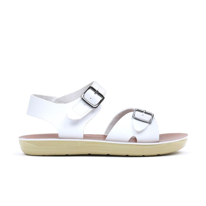 Journey White Sandals is a super comfortable sandal with a soft leather feeling and a wide insole design. The front buckle is a real buckle, easily adjustable to fit nicely with your kid's feet. The upper buckle is a faux buckle made with a velcro fastening across the ankle strap to make it easier for kids to put on and off by themselves. It is made of water-resistant material so it's great to wear anytime, anywhere.